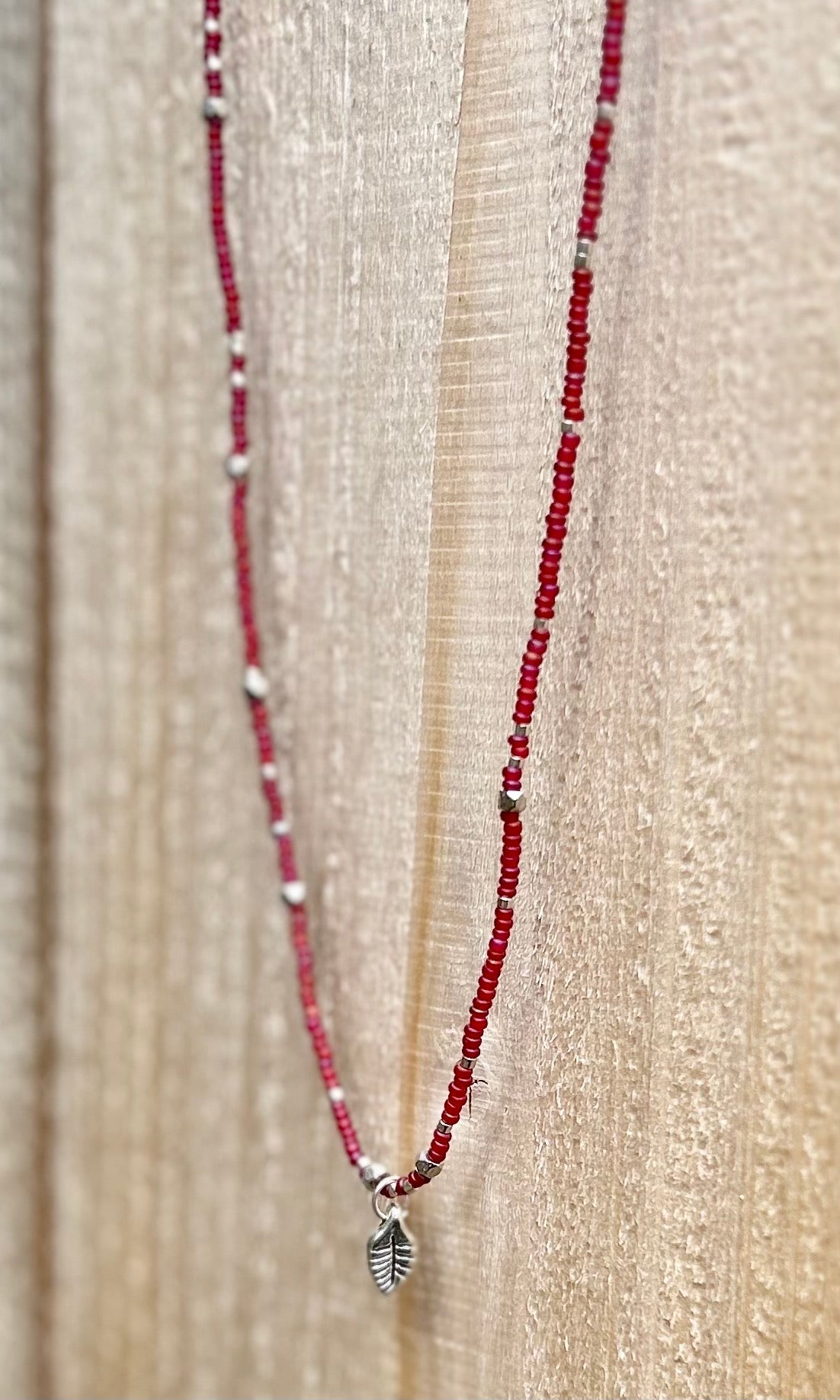 Magenta Seed Bead Boho Necklace with Silver Leaf Charm